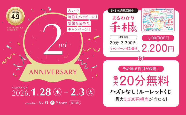 「こんなことまでわかるの?」と話題の「まるわかり手相」が特別価格!ハズレなしのルーレットくじも!ザッパラスグループが手掛ける占いの店『cocoloni占い館』立川店が2周年キャンペーンを開催!