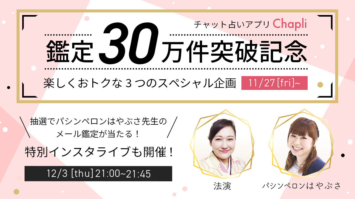 チャット占いアプリ『Chapli』が鑑定30万件突破!テレビや雑誌で活躍する人気占い師に占って貰える特別企画を含む3大キャンペーンを開催!~「スピリチュアル芸人」として多数のメディアで活躍のパシンペロンはやぶさ先生のメール鑑定が当たるチャンスも!~