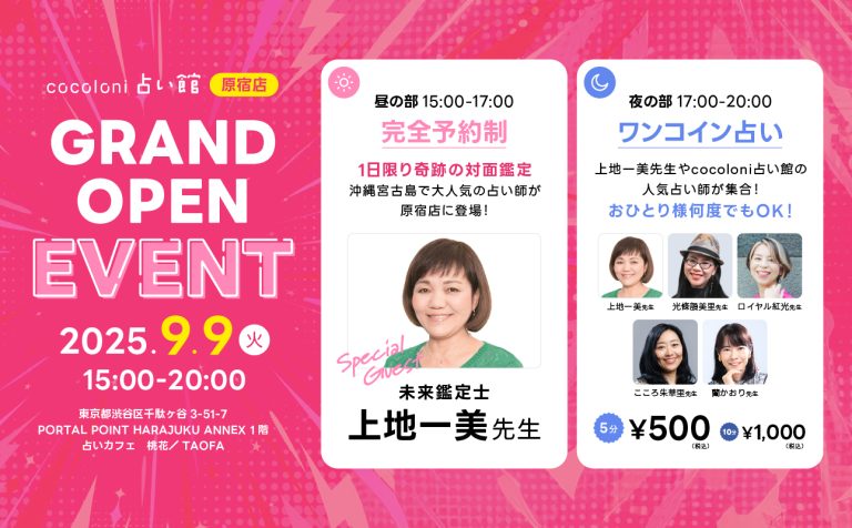 【スペシャルゲスト】沖縄・宮古島で絶大な人気を誇る未来鑑定士・上地一美先生が登場!グランドオープン記念!1日限りのスペシャル企画開催!~『cocoloni占い館』原宿店~